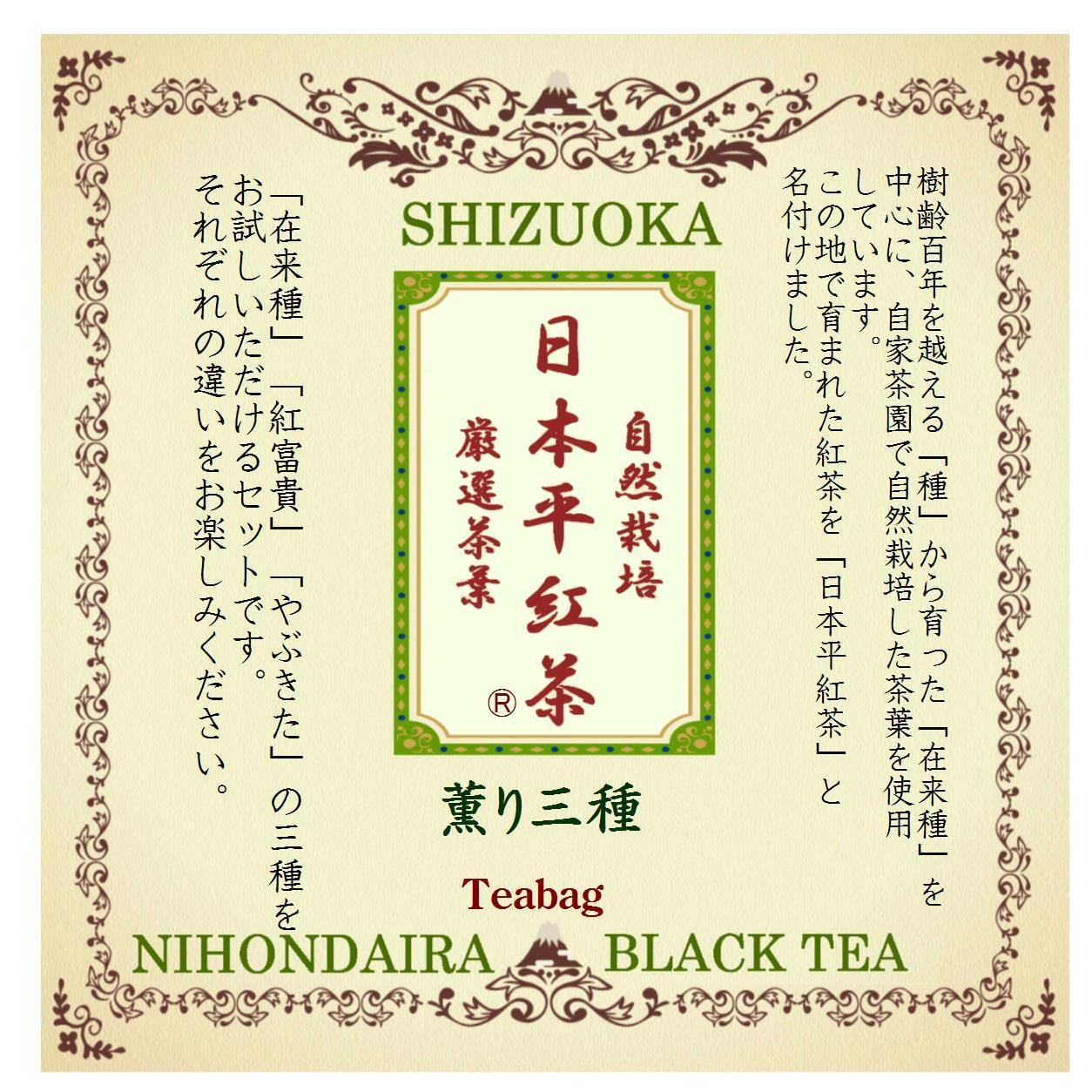 「在来種」「藪北」「紅富貴」の3種類の紅茶のアソートパックです。